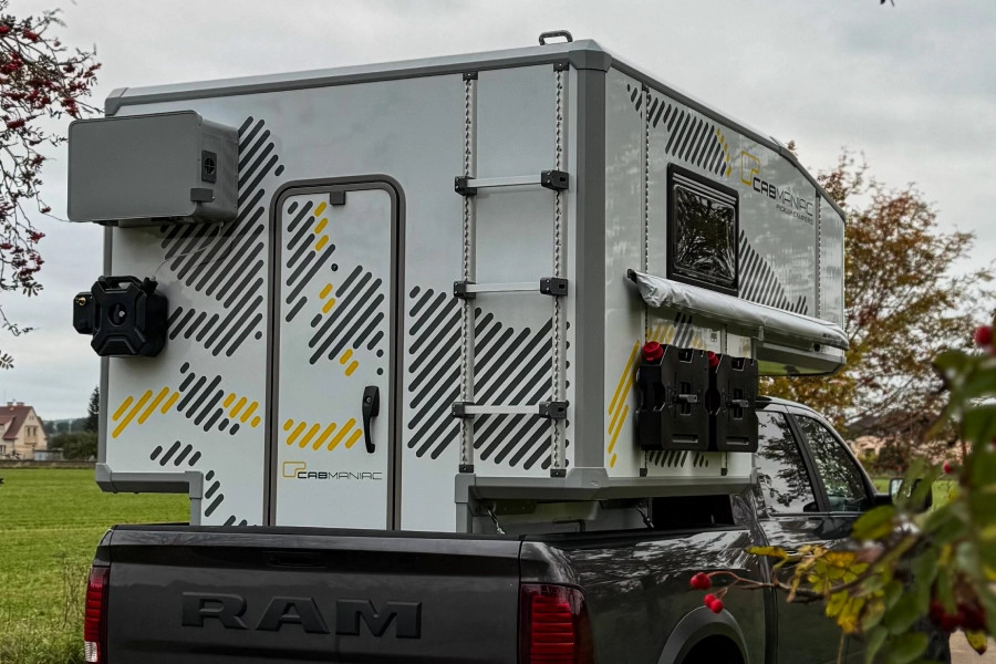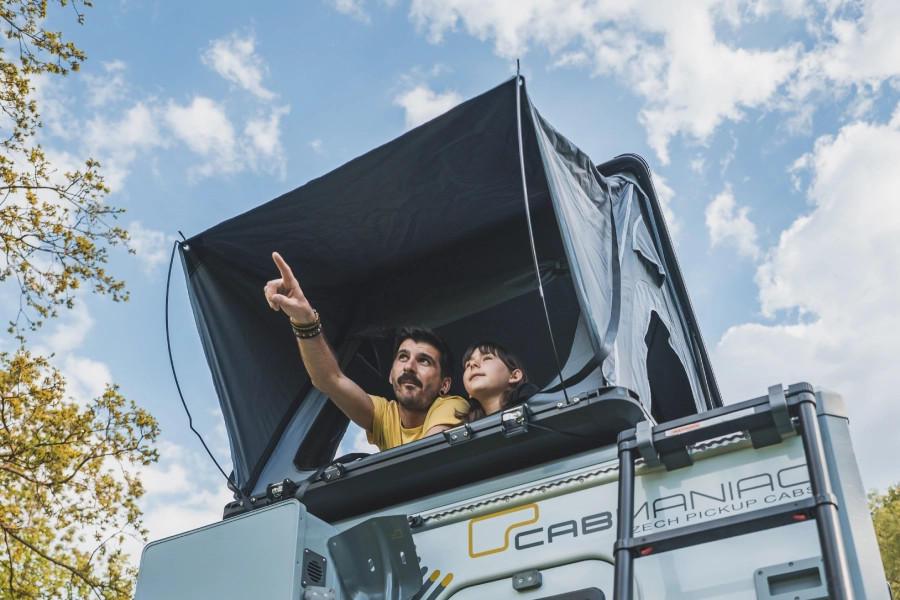 We thoroughly tested the roof tent with a 200×120 cm bed in strong wind and rain. Thanks to taped seams, the tent does not leak even in heavy rain. All walls can be unzipped and are equipped with mosquito nets. Inside, there is a pocket for shoes and a ceiling net for storing clothes, and the closed tent can even fit a duvet or sleeping bag. It takes about 30 seconds to unfold and fold up, and it is accessed from the rear of the superstructure. The roof is walkable. The tent is installed on the Airline roof rails, so it can be removed from the superstructure.