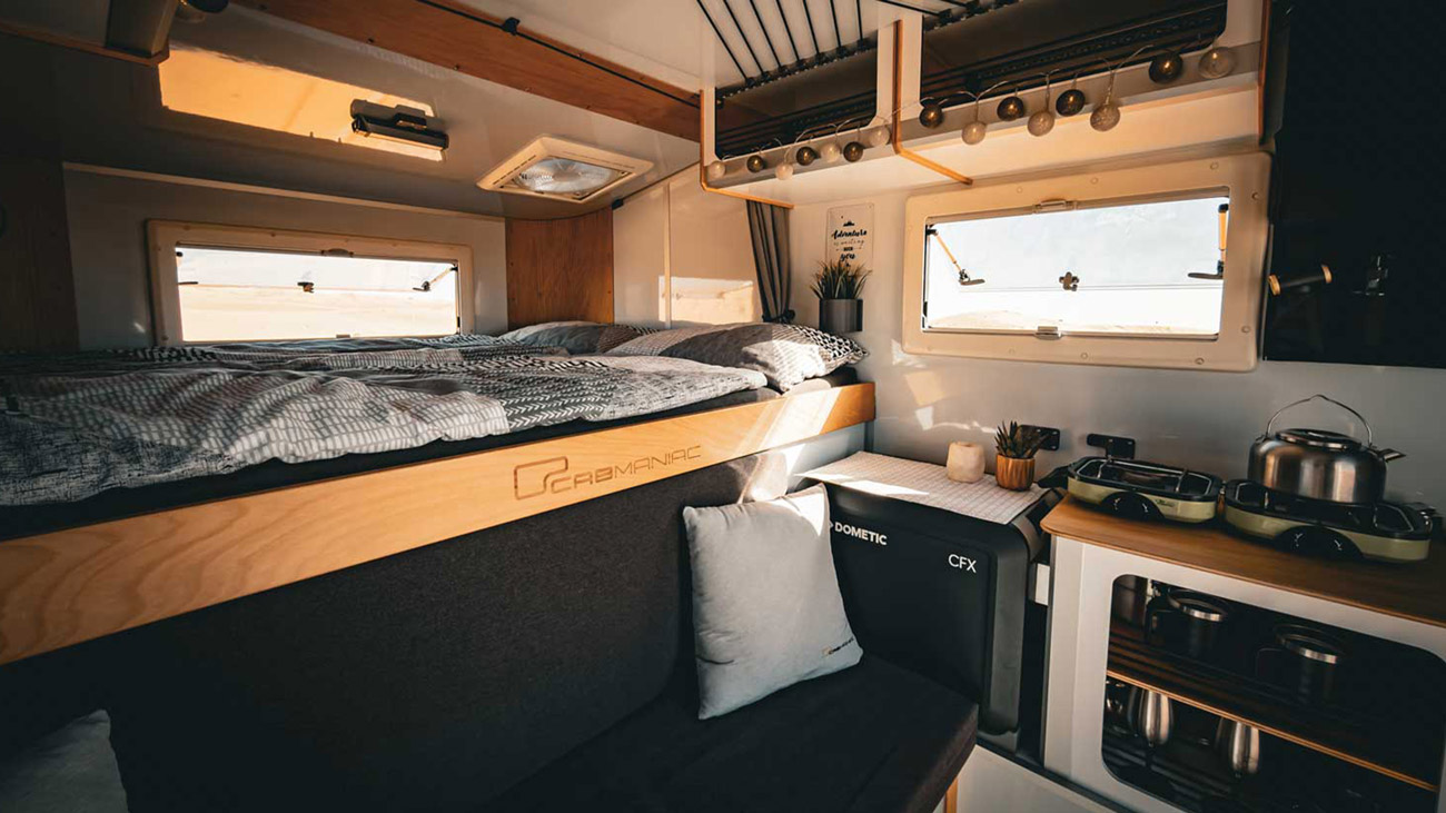 Thanks to the extendable bed, the interior features a 183x190 cm sleeping area, which can accommodate a family with children. A rooftop tent can be added for even more sleeping capacity.